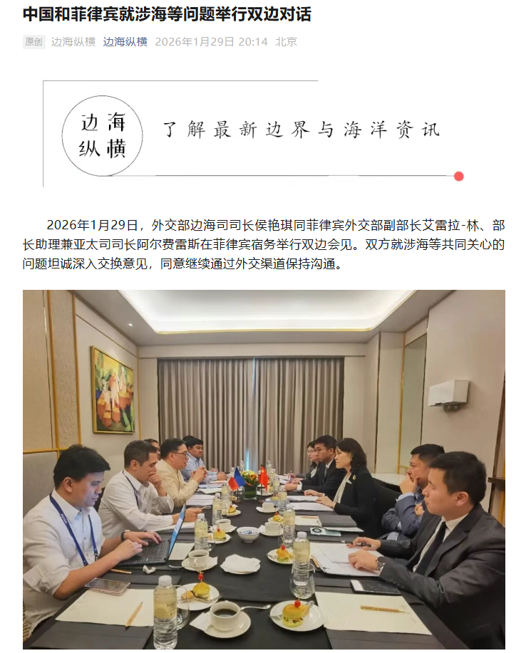 2026年1月29日,外交部边海司司长侯艳琪同菲律宾外交部副部长艾雷拉-林、部长助理兼亚太司司长阿尔费雷斯在菲律宾宿务举行双边会见。双方就涉海等共同关心的问题坦诚深入交换意见,同意继续通过外交渠道保持沟通。