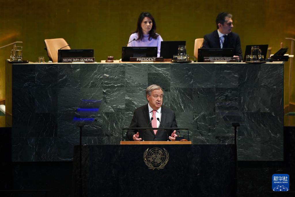 9月22日,在位于纽约的联合国总部,联合国秘书长安东尼奥·古特雷斯(前)在纪念联合国成立80周年高级别会议上讲话。新华社记者 李睿 摄