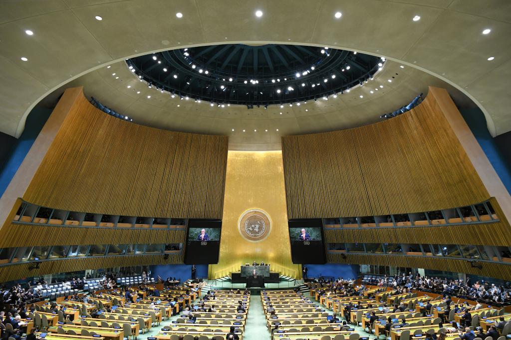 9月26日,在位于纽约的联合国总部,以色列总理内塔尼亚胡在第80届联合国大会一般性辩论上发言。众多联合国会员国代表起身离席,退场抗议。新华社记者李睿摄