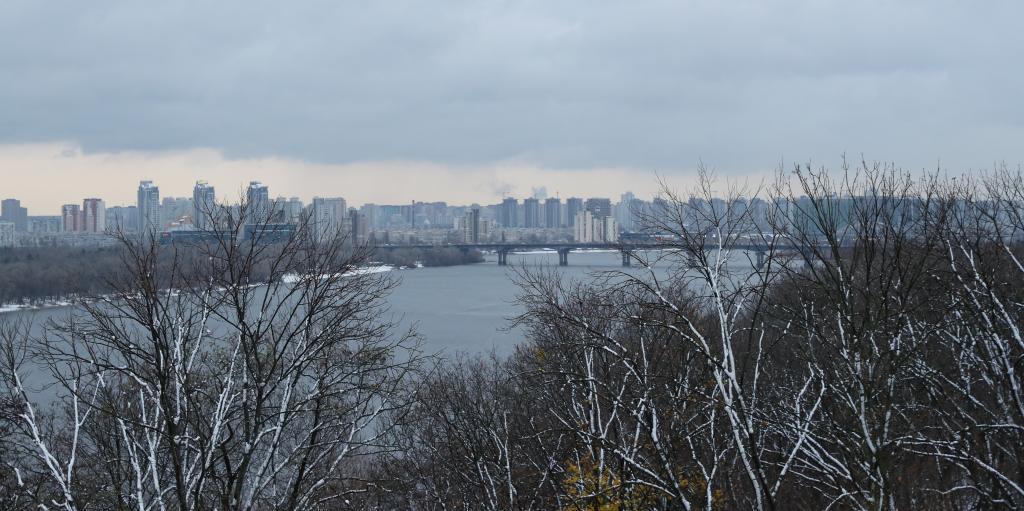 这是2024年11月21日在乌克兰首都基辅拍摄的白雪映衬下的第聂伯河和巴顿桥。新华社记者李东旭摄