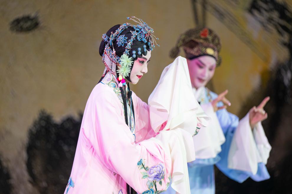 4月12日,中国戏剧梅花奖获得者单雯(左)在第四届粤港澳大湾区中国戏剧文化节开幕戏剧晚会上表演昆曲《牡丹亭》选段。新华社记者 张金加 摄