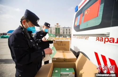 内蒙古援助蒙古国第二批抗疫防控物资从二连口岸出境。郭鹏杰 摄