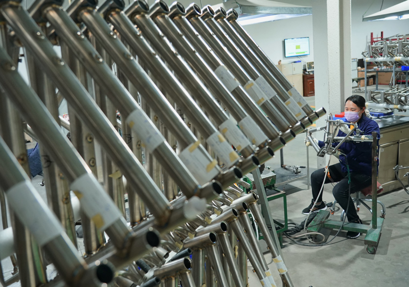 5月7日,工人在昌黎县工业园区内的一家自行车生产企业的生产车间工作。