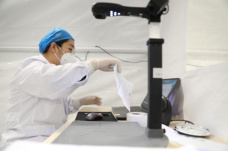11月15日,大连方舱核酸检测实验室工作人员在扩增区录入检测数据。