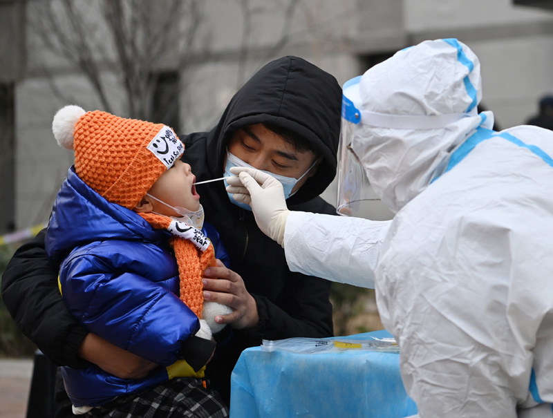 1月9日,在天津滨海高新区的一处核酸检测点,小朋友在家长陪同下接受核酸采样。