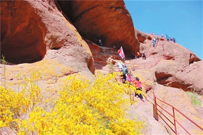 站在望霞亭俯瞰火石寨美景尽收眼底,在满是白桦林的情人谷中散散步,更有造型独特的象鼻山等你细细揣摩。红岩山色、峭岩石窟、紫色丁香,构成了一幅风光旖旎的塞上丹霞画卷。