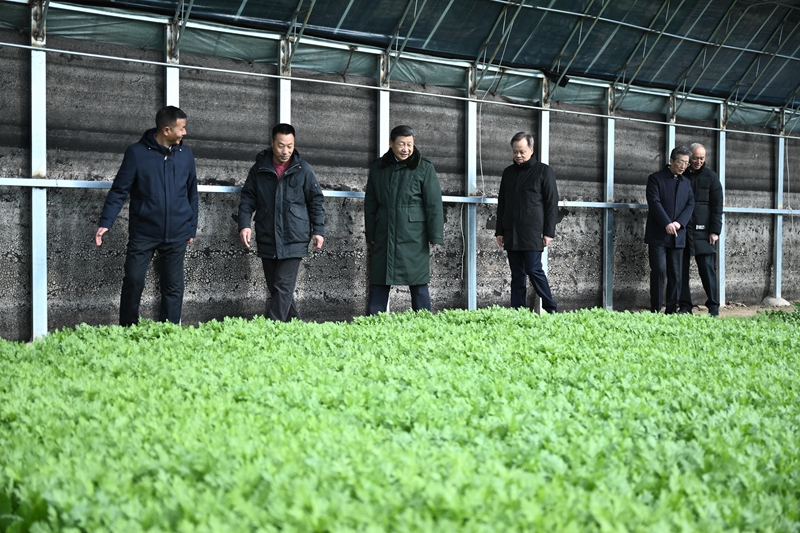 2月1日至2日,中共中央总书记、国家主席、中央军委主席习近平来到天津,看望慰问基层干部群众。这是1日上午,习近平在西青区辛口镇第六埠村实地察看去年洪涝灾害后当地农业生产恢复等情况时,走进大棚看蔬菜长势。新华社记者 燕雁 摄