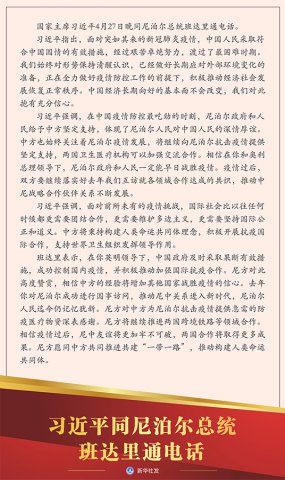 习近平主席当晚分别同尼泊尔总统班达里、伊朗总统鲁哈尼通电话。疫情发生以来,习主席亲力亲为,密集开展元首外交,与各方领导人共商抗疫大计。以“电话外交”为例,截至4月27日,习主席已...
