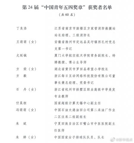 第24届中国青年五四奖章评选结果揭晓名单