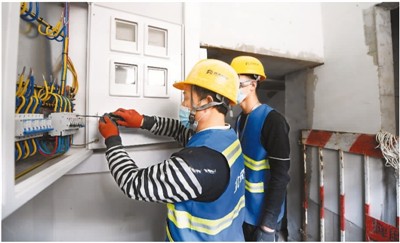 图为3月25日,工人在北京农光里重汽小区进行老楼改造工程施工作业。新华社记者 鞠焕宗摄