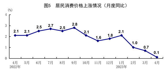 4月份,全国居民消费价格(CPI)同比上涨0.1%,环比下降0.1%。分类别看,食品烟酒价格同比上涨0.8%,衣着价格上涨0.9%,居住价格下降0.2%,生活用品及服务价格上涨0.1%,交通通信价格下降3.3%,教育文化娱乐价格上涨1.9%,医疗保健价格上涨1.0%,其他用品及服务价格上涨3.5%。在食品烟酒价格中,鲜菜价格下降13.5%,粮食价格上涨1.1%,猪肉价格上涨4.0%,鲜果价格上涨5.3%。扣除食品和能源价格后的核心CPI同比上涨0.7%,涨幅与上月相同。1-4月份,全国居民消费价格同比上涨1.0%。