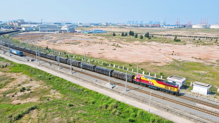 4月26日,一列行进中的西部陆海新通道海铁联运班列(无人机照片)。新华社发(广西北部湾国际港务集团供图)