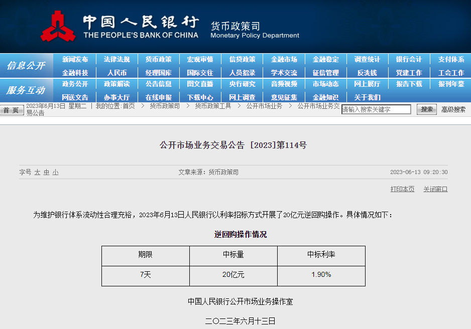 导读: 6月13日,中国人民银行以利率招标方式开展了20亿元逆回购操作,中标利率较此前下降10个基点。专家表示,此次操作释放了加强逆周期调节和稳定市场预期的政策信号。