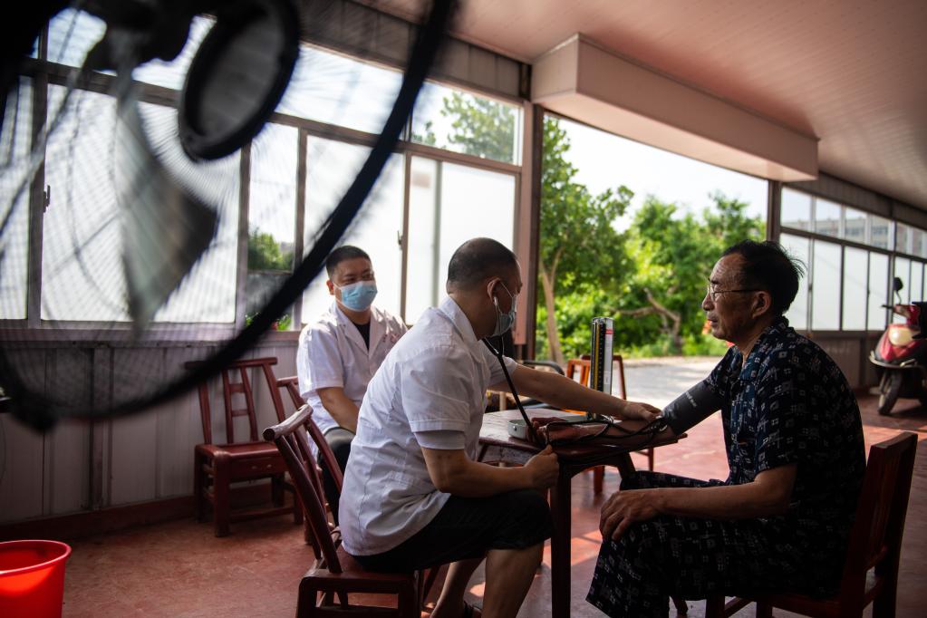 2023年6月21日,在湖南省常德市安乡县深柳镇下码头社区,医护人员上门为老年人做健康护理服务。新华社记者 陈思汗 摄