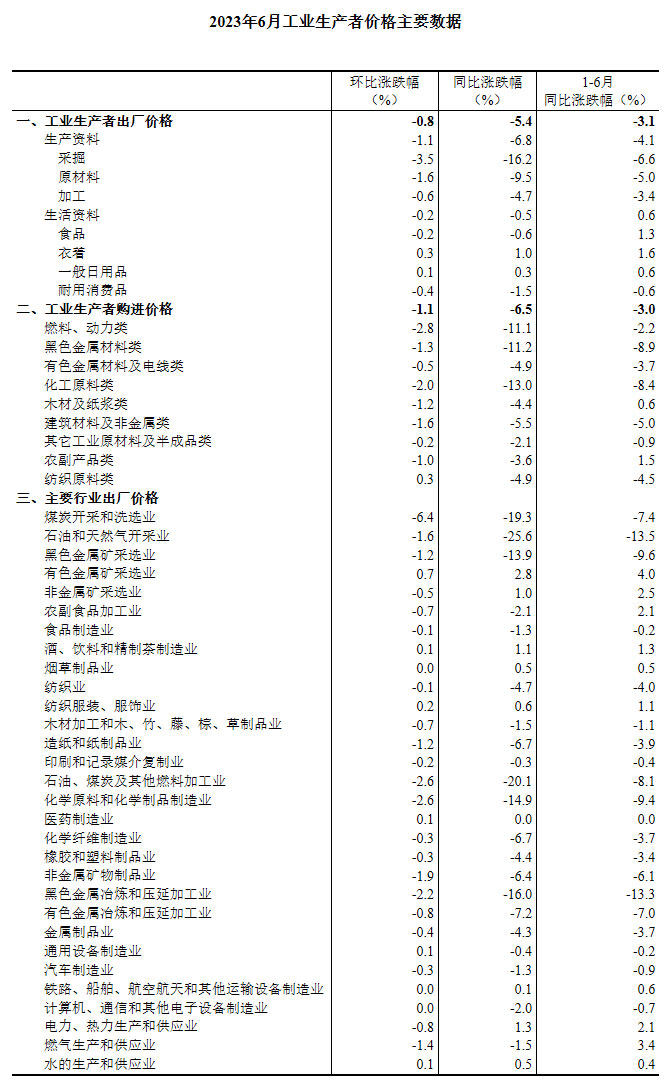 2023年6月份,全国工业生产者出厂价格同比下降5.4%,环比下降0.8%;工业生产者购进价格同比下降6.5%,环比下降1.1%。上半年,工业生产者出厂价格比上年同期下降3.1%,工业生产者购进价格下降3.0%。