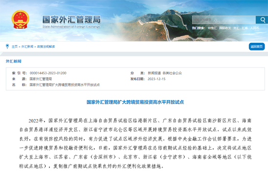 国家外汇管理局扩大跨境贸易投资高水平开放试点。来源:国家外汇管理局官网