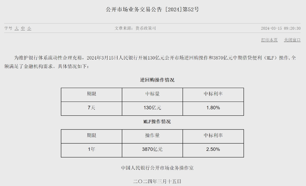 导读:为维护银行体系流动性合理充裕,3月15日中国人民银行开展130亿元公开市场逆回购操作和3870亿元中期借贷便利(MLF)操作。中国人民银行公告称,此举全额满足了金融机构需求。