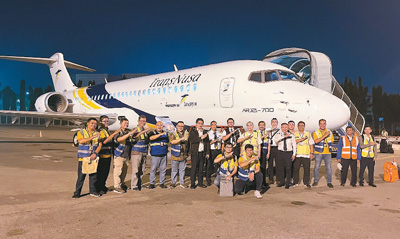 中国飞机租赁集团向印度尼西亚翎亚航空交付的第三架国产喷气式ARJ21飞机于5月31日傍晚抵达印尼首都雅加达。这是国产飞机的首单人民币跨境结算交易。图为在印度尼西亚雅加达苏加诺—哈达国际机场,工作人员在国产喷气式ARJ21飞机前合影。印尼翎亚航空供图(新华社发)