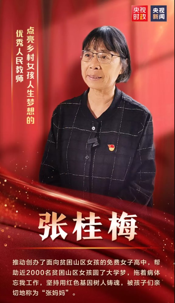 大家好!我叫张桂梅,是一名普通的人民教师。习近平总书记将代表党内最高荣誉的“七一勋章”授予我们29名同志,这份光荣属于奋战在各条战线上的每一名共产党员。请允许我代表今天受到表彰的同志们,感谢党中央对我们的充分肯定,感谢广大党员群众对我们的支持和信任!