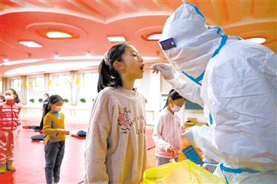 1月21日,参加北京冬奥会开幕式演出的北京市海淀区实验小学六年级(10)班学生杜卡妮在做例行核酸检测。记者 单艺伟 摄