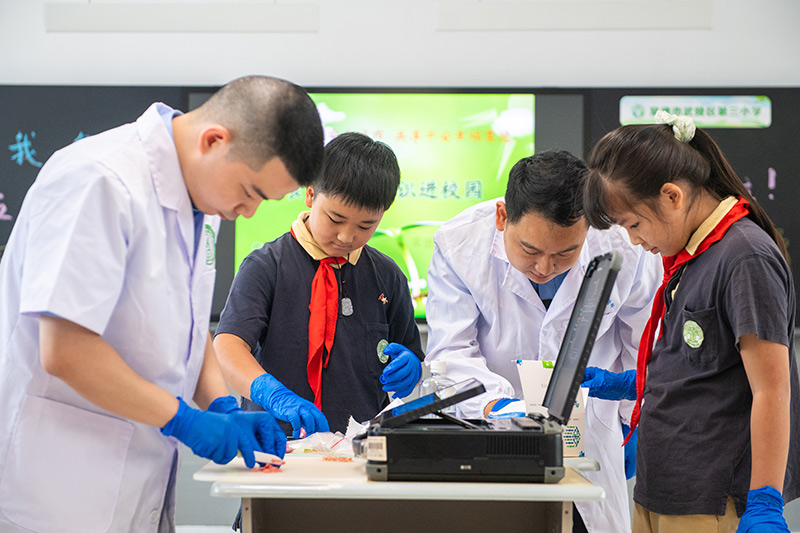 8月31日,湖南省常德市市场监督管理局在常德市武陵区第三小学开展关于食品安全的“开学第一课”。这是工作人员指导学生进行食品安全快速检测实验。