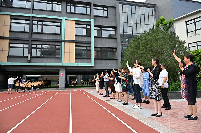 8月31日,北京第二实验小学为一年级新生举办开笔礼。这是老师在开笔礼上迎接新生入场。