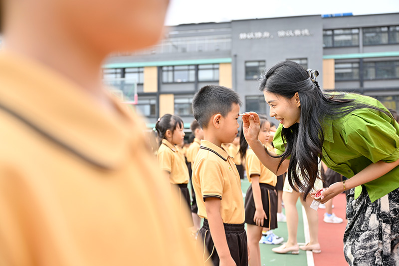 8月31日,北京第二实验小学为一年级新生举办开笔礼。这是老师在开笔礼上为学生点朱砂启智。