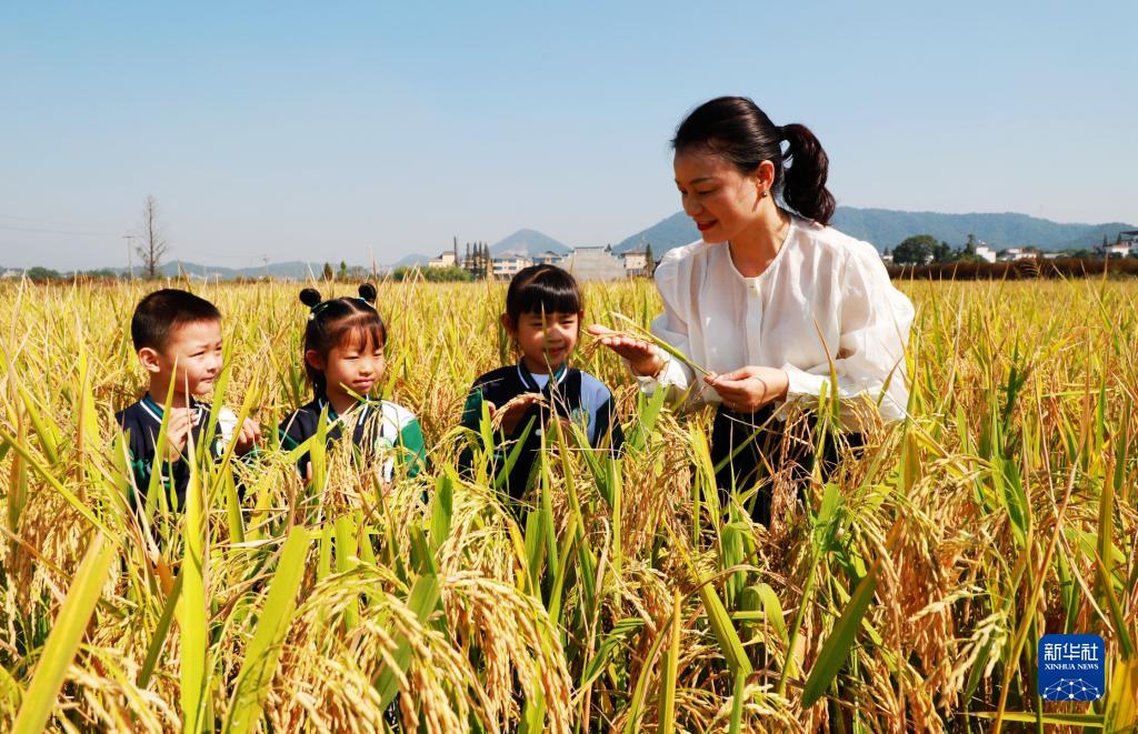 10月16日,在浙江省湖州市德清县钟管村的稻田里,农户为钟管小学的学生讲解水稻种植知识。