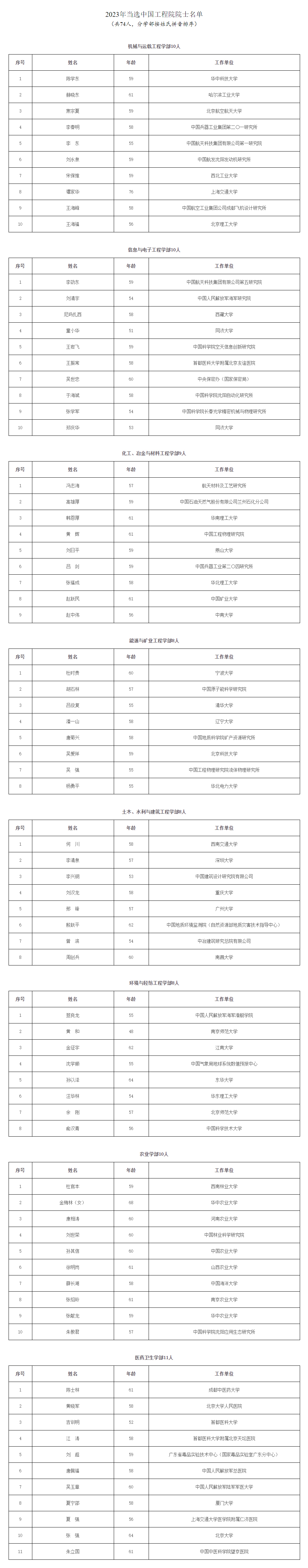 导读:关于公布中国工程院2023年院士增选当选院士名单的公告 中国工程院2023年院士增选共选举产生74位中国工程院院士。 现予公布。 中国工程院 2023年11月22日