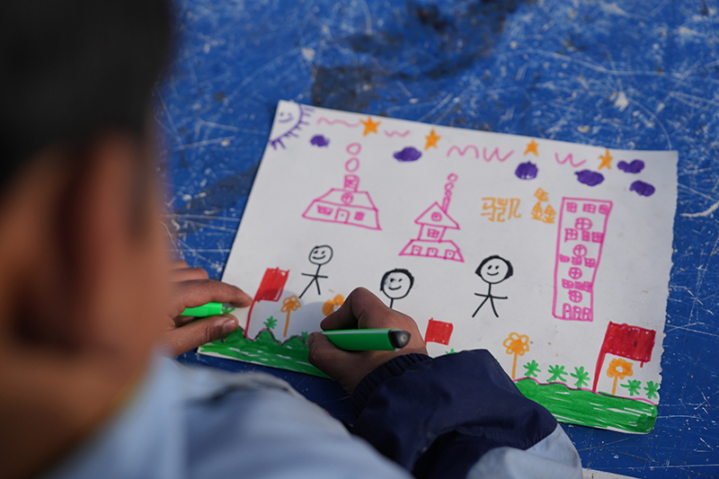 12月22日,在积石山县大河家镇大河村安置点,小朋友在画画。