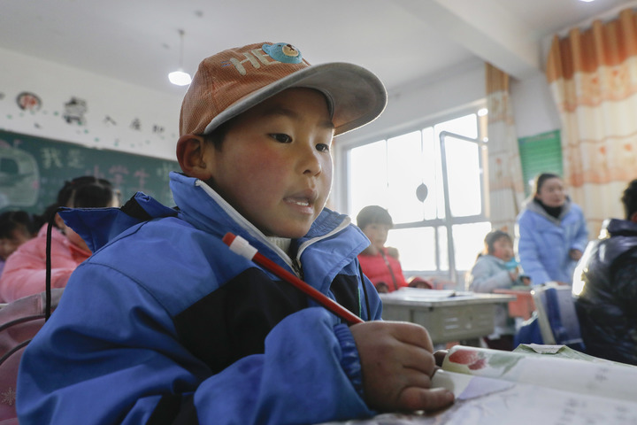 12月25日,积石山县柳沟乡阳山希望小学的学生在上语文课。新华社记者 方欣 摄