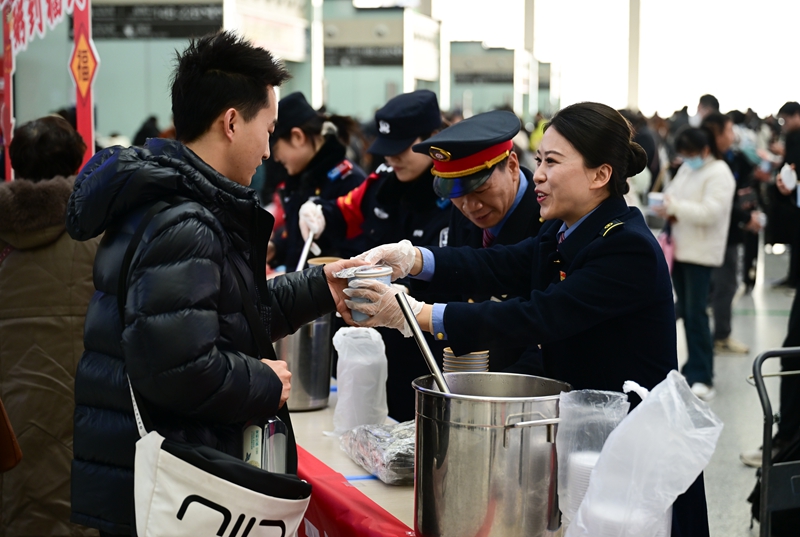 1月6日,在合肥南站候车大厅,工作人员将腊八粥送给旅客。