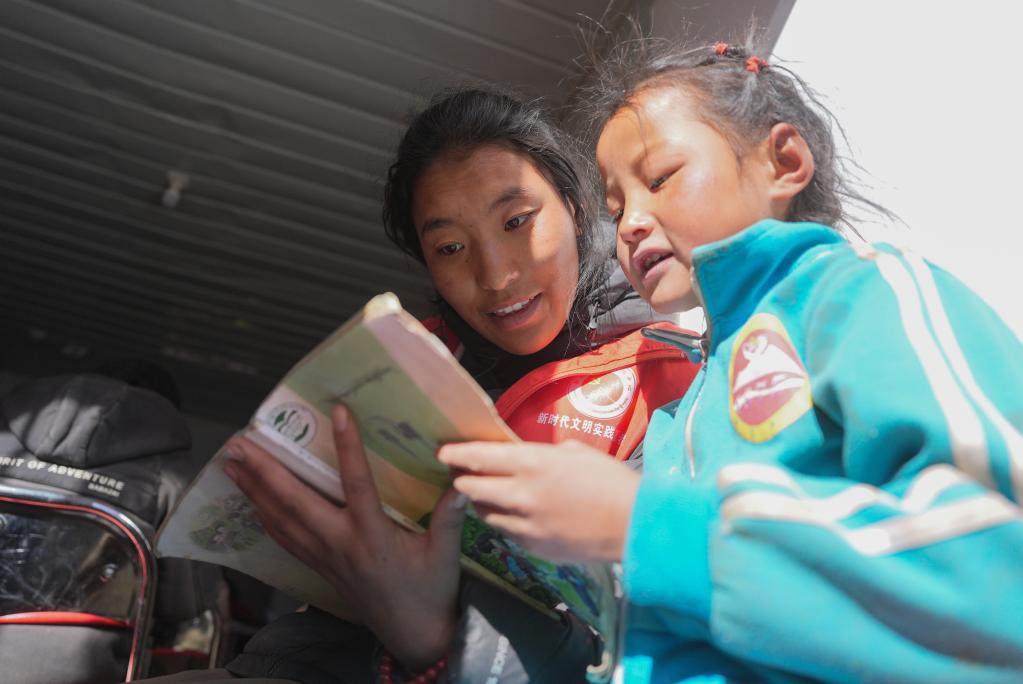 1月25日,在定日县曲洛乡热木青村安置点,大学生志愿者在安置点在给孩子们辅导功课。新华社记者 晋美多吉 摄