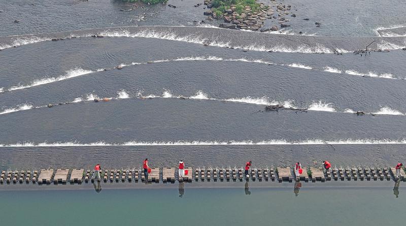 4月21日,浙江省台州市仙居县白塔镇第一幼儿园老师与河长在永安溪巡河护水(无人机照片)。