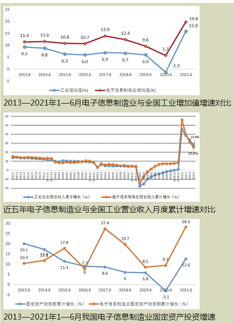 2021年上半年我国电子信息制造业继续保持发展活力,行业增加值、固定资产投资、出口交货值三大主要指标均呈现20%以上的快速增长,为近年来较高水平,但较第一季度(40%)增速有所下滑。值此“十四五”谋篇布局之际,我国电子信息制造业高质量发展仍需增强内生动力和保持发展定力,才能强化优势、抢占前沿、实现跃升。 上半年电子信息制造业增加值增速为19.8% (一)增加值增速处于近年较好水平 国家统计局数据显示,1—6月,电子信息制造业增加值增速为19.8%,为近年来增速较好水平。与同期主要制造业行业相比,行业增加值增速处于正常水平,在17个主要制造业行业中排位第七,增速次于医药制造业(29.6%)、电气机械和器材制造业(29.4%)、金属制品业(28.2%)、通用设备制造业(24.3%)、汽车制造业(21.8%)、专用设备制造业(20.1%)。与同期工业整体水平相比,1—6月行业增加值较规模以上工业增加值增速(15.9%)高3.9个百分点。电子信息制造业对工业增长的引领作用依旧,2017年上半年二者差距达到峰值(7个百分点),约为当前差距两倍,领先优势不断缩减。 (二)营业收入增速从高位逐渐回落 今年上半年,电子信息制造业营业收入同比增长25.8%,仍处于较高水平。整体与工业企业收入增长同步,电子信息制造业开年大幅增长,1—2月累计增速高达55.8%,高于同期工业增速近10个百分点,但3月以来增速迅速降低至25%左右,低于同期工业企业营收增速(27.9%)2.1个百分点,下降幅度大、速度快,增速逐渐出现低于工业收入增长的苗头性趋势。 (三)固定资产投资为近八年来最高水平 上半年电子信息制造业固定资产投资增速为28.3%,高于去年同期增速(9.4%)18.9个百分点,高于今年同期制造业投资增速(12.6%)15.7个百分点。在主要制造业行业投资中,电子信息行业排名第五,次于铁路、船舶、航空航天和其他运输设备制造业(31.4%),化学原料和化学制品制造业(30.1%),农副食品加工业(29.8%),专用设备制造业(28.5%)。 (四)出口增速处于近年行业较好水平 1—6月,电子信息产品出口交货值为29461.2亿元,增速为17.6%,处于近年来的较高水平,但较同期工业出口交货值增速(22.9%)低5.3个百分点。电子信息产品出口与工业出口增长走势高度一致,当前电子信息产品出口交货值占全国工业出口交货值(66673.6亿元)的44.2%,近两年来一直较为平稳,基本保持在44%以上,体现出电子信息产品在出口中的重要地位。 (五)主要产品出现正负增长分化态势 一方面,手机、计算机两大智能终端发展均处于较好水平。从统计数据看,今年上半年,手机产量(7.54亿台)和计算机产量(2.2亿台)增速分别为21.1%和43.9%,其中智能手机产量增长17.1%,充分显示出手机和计算机两大消费电子产品在产业生态中的稳定地位。 另一方面,彩电行业整体出现增速下滑并逐渐呈现负增长。今年上半年彩电产量增速为-2.5%,再次逆转去年疫情以来的良好增长态势。据中国电子视像行业协会反映,今年以来彩电内需下滑显著,上半年销量从5000万台降至4000万台,这是一个需求迅速下滑的信号,值得跟踪研究。与此同时,集成电路、光电子器件等元器件产品高速增长。今年上半年,我国生产集成电路1712亿块、光电子器件5961亿只,增速均达40%以上,既反映了电子产品高端化带来的全球元器件高涨需求,又反映出我国基础电子领域实力强化。 从计算机市场数据看,今年上半年,联想继续保持全球电脑市场出货量第一,约占全球市场的1/4,较第二的惠普高出近1个百分点,并且二者增速拉开较大差距,联想产品实现3.6%的正增长,但惠普产品正以-11.3%的速度减少向全球市场供应。 从智能手机市场数据看,智能手机市场进一步洗牌,华为跌出前五(去年同期为第二名,18.9%占比),除三星占比略有下滑,苹果、小米、OPPO、vivo的出货量均有上涨,可见,华为手机销量下滑的巨大市场份额被头部手机厂商均分。前五位企业全球占比为62.5%,较去年同期有所降低,意味着有更多机会给予二、三线手机品牌参与竞争。 值得关注的是,在主要产品整体保持良好态势的基础上,移动通信基站产量却持续下滑。作为5G投资的最大受益产品,2019年上半年产量出现100%~150%的超高速增长,于下半年快速降至10%~15%,从去年上半年开始出现负增长,今年上半年负增长持续加剧(-55.5%)。这反映出当前5G基础设施建设进入低谷,由于5G应用场景滞后,运营商从投入产出考虑对建设基站意愿衰减。 下半年固定资产投资有望维持在20% 面对更为复杂多变的国内外形势,下半年电子信息产业发展仍面临新的挑战和机遇。 (一)需关注主要发达国家信息技术领域新的战略部署 3月,欧盟提出“数字罗盘”计划,计划投入1300亿欧元发展数字工业,旨在缩小与中美在芯片制造、人工智能等领域的差距。欧盟还发布了《数字服务法案》《数字市场法案》,加大对数字经济反垄断的管理。同时,德国修订了《人工智能战略》,计划资助力度从30亿欧元增加到50亿欧元。5月,韩国公布“K半导体战略”,计划未来10年投资约4500亿美元,将韩国建设成全球最大的半导体制造基地。6月,日本发布半导体新战略,包括确保尖端半导体制造能力、加快数字投资和加强逻辑芯片设计与开发、促进绿色创新、确保半导体产业投资弹性等方向,以期强振日本半导体产业。 今年以来,欧、日、韩等纷纷出台国家战略及扶持政策,加大在半导体、人工智能、数字经济等信息技术相关