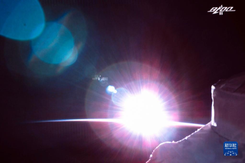 7月17日在北京航天飞行控制中心拍摄的天舟三号货运飞船撤离空间站组合体图像。这是天舟三号货运飞船正在向200米停泊点撤离。新华社记者 郭中正 摄