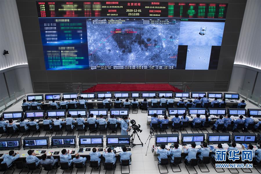 12月1日,在北京航天飞行控制中心拍摄的嫦娥五号探测器落月瞬间。 新华社记者 金立旺 摄