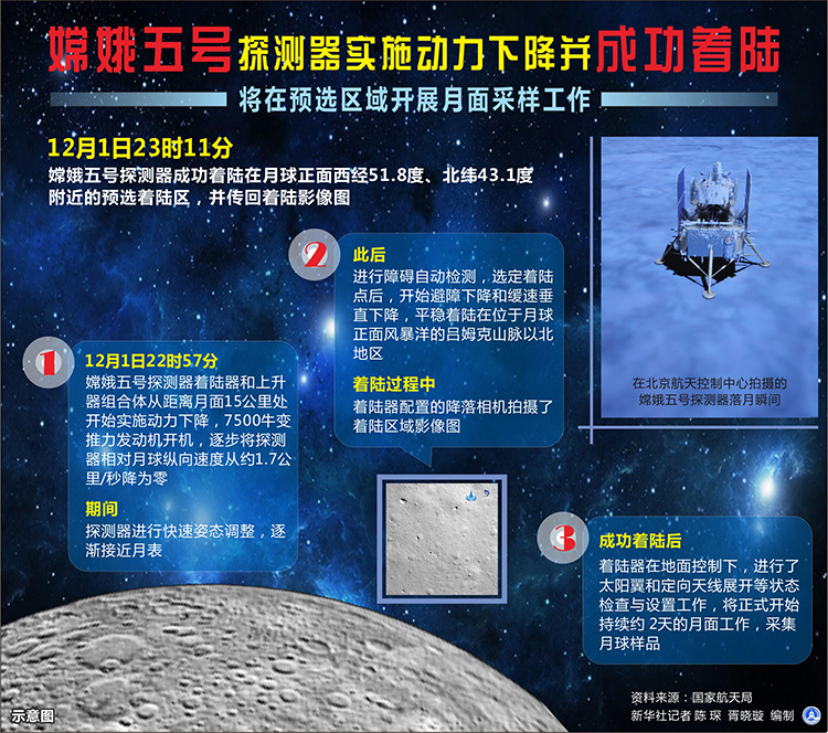 图表:嫦娥五号探测器实施动力下降并成功着陆 将在预选区域开展月面采样工作 新华社记者 陈琛 编制