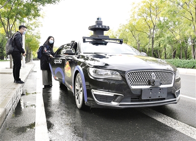市民在北京市海淀区稻香湖路的百度自动驾驶出租车指定上车点乘车。记者 任超 摄