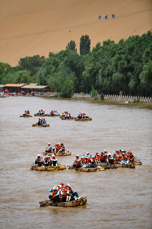 盛夏时节,地处黄河之畔与腾格里沙漠边缘的宁夏中卫市沙坡头景区迎来大批游客,人们在这里体验羊皮筏子漂流、沙漠冲浪、滑沙、沙漠观星等项目。据了解,进入暑期,宁夏中卫市沙坡头景区客流量大幅增长,日客流量最高超过1万人次。