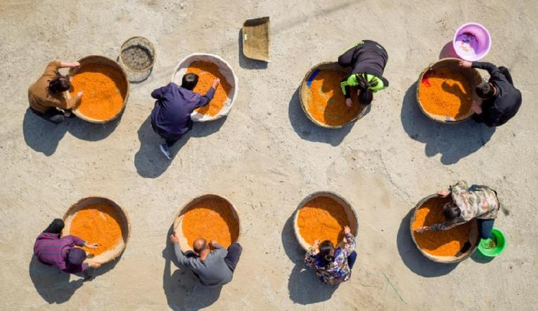 方山县郝家庄村民对采摘的沙棘进行二次筛选。(刘亮亮 摄)