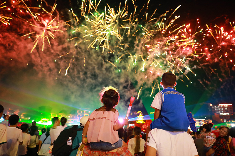 10月1日,游客在贵州省黔东南苗族侗族自治州凯里市下司古镇观赏烟花。