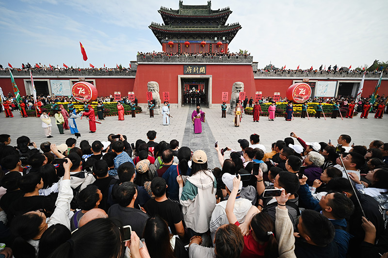 10月3日,游客在河南省开封市开封府门前观看《开衙迎宾》仪式。