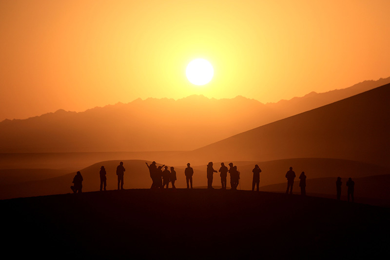 10月2日清晨,游客在甘肃省敦煌市鸣沙山月牙泉景区观赏日出。