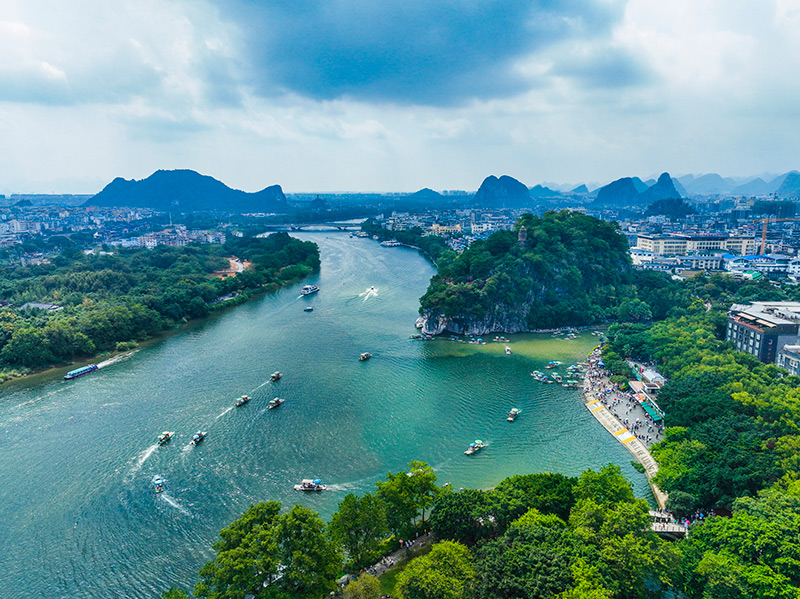 10月3日,在广西桂林市,游客乘船游览漓江(无人机照片)。