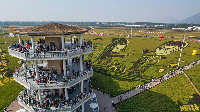 10月3日,游客在河北省遵化市一景区观景台观赏稻田画(无人机照片)。