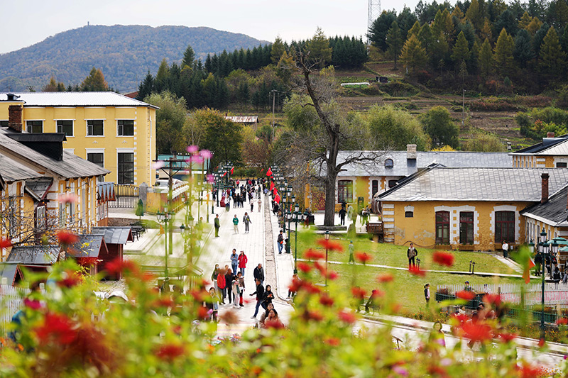10月3日,游客在黑龙江省海林市横道河子镇的文化艺术主题街区游览。