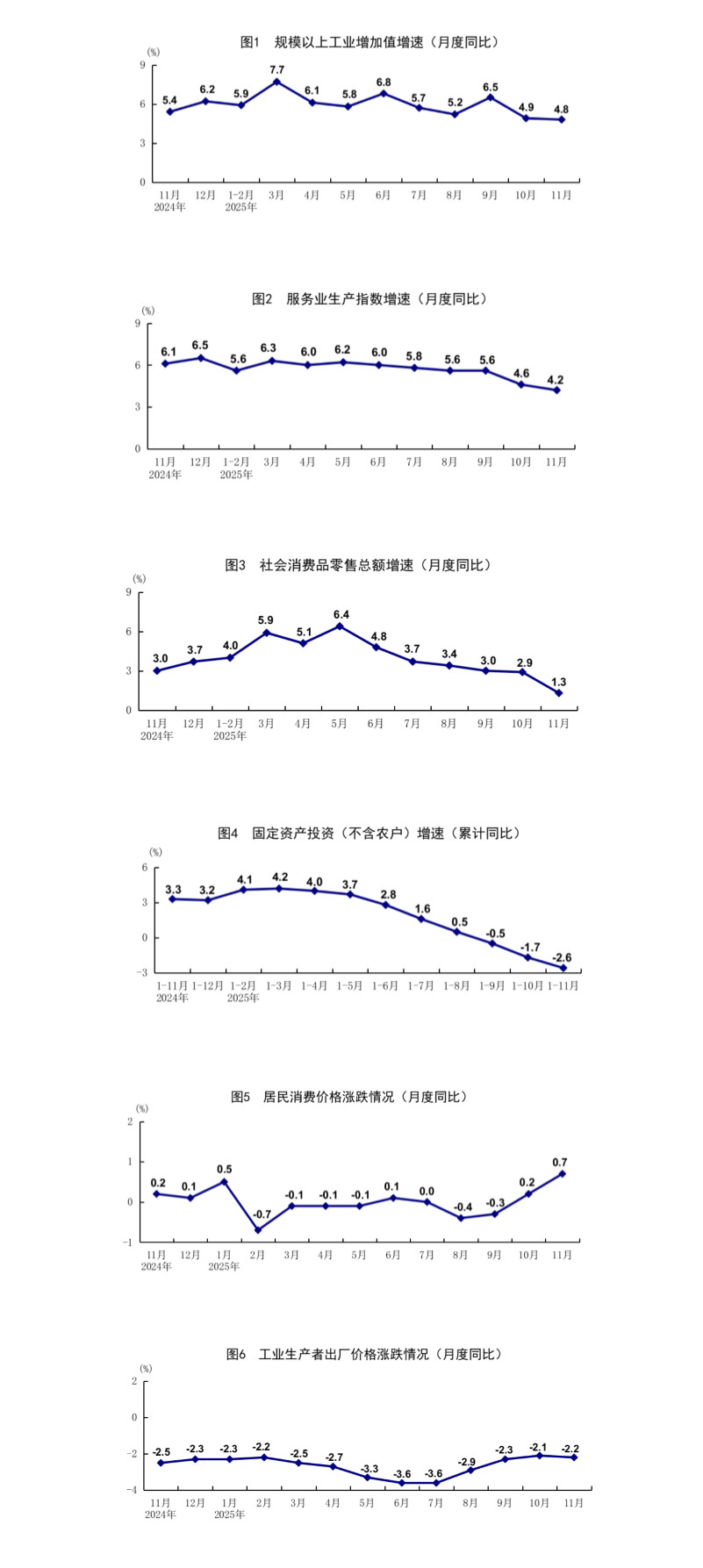 11月份,在以习近平同志为核心的党中央坚强领导下,各地区各部门认真贯彻落实党中央、国务院决策部署,坚持稳中求进工作总基调,深入实施更加积极有为的宏观政策,纵深推进全国统一大市场建设,着力推动高质量发展,生产供给基本平稳,就业形势总体稳定,市场价格继续改善,新质生产力稳步发展,经济运行延续总体平稳、稳中有进发展态势。 一、全年粮食实现丰收,稳定在1.4万亿斤以上 全年全国粮食产量14298亿斤,比上年增加167.5亿斤,增长1.2%,稳定在1.4万亿斤以上。其中,秋粮产量10732亿斤,比上年增加163.6亿斤,增长1.5%。全国谷物产量13204亿斤,比上年增加158.4亿斤,增长1.2%。粮食播种面积增加、单产提高。全国粮食播种面积17.91亿亩,比上年增加134.8万亩,增长0.1%;粮食单产399.1公斤/亩,每亩产量比上年增加4.4公斤,增长1.1%。 二、工业生产稳定增长,装备制造业和高技术制造业增长较快 11月份,全国规模以上工业增加值同比增长4.8%,环比增长0.44%。分三大门类看,采矿业增加值同比增长6.3%,制造业增长4.6%,电力、热力、燃气及水生产和供应业增长4.3%。装备制造业增加值同比增长7.7%,高技术制造业增加值增长8.4%,分别快于全部规模以上工业增加值2.9和3.6个百分点。分经济类型看,国有控股企业增加值同比增长4.2%;股份制企业增长5.2%,外商及港澳台投资企业增长3.4%;私营企业增长3.2%。分产品看,3D打印设备、工业机器人、新能源汽车产品产量同比分别增长100.5%、20.6%、17.0%。1-11月份,全国规模以上工业增加值同比增长6.0%。11月份,制造业采购经理指数为49.2%,比上月上升0.2个百分点;企业生产经营活动预期指数为53.1%,上升0.3个百分点。1-10月份,全国规模以上工业企业实现利润总额59503亿元,同比增长1.9%。 三、服务业平稳增长,现代服务业发展向好 11月份,全国服务业生产指数同比增长4.2%。分行业看,信息传输、软件和信息技术服务业,租赁和商务服务业,金融业生产指数同比分别增长12.9%、8.4%、5.1%,分别快于服务业生产指数8.7、4.2、0.9个百分点。1-11月份,全国服务业生产指数同比增长5.6%。1-10月份,规模以上服务业企业营业收入同比增长7.6%。11月份,服务业商务活动指数为49.5%,服务业业务活动预期指数为55.9%。其中,铁路运输、电信广播电视及卫星传输服务、货币金融服务等行业商务活动指数位于55.0%以上较高景气区间。 四、市场销售规模扩大,服务零售增长加快 11月份,社会消费品零售总额43898亿元,同比增长1.3%;环比下降0.42%。按经营单位所在地分,城镇消费品零售额37684亿元,同比增长1.0%;乡村消费品零售额6214亿元,增长2.8%。按消费类型分,商品零售额37841亿元,增长1.0%;餐饮收入6057亿元,增长3.2%。基本生活类和部分升级类商品销售增长较快。限额以上单位粮油食品类、通讯器材类、文化办公用品类商品零售额同比分别增长6.1%、20.6%、11.7%。1-11月份,社会消费品零售总额456067亿元,同比增长4.0%。全国网上零售额144582亿元,同比增长9.1%。其中,实物商品网上零售额118193亿元,增长5.7%,占社会消费品零售总额的比重为25.9%。1-11月份,服务零售额同比增长5.4%,增速比1-10月份加快0.1个百分点。其中,文体休闲服务类、通讯信息服务类、旅游咨询租赁服务类、交通出行服务类零售额较快增长。 五、固定资产投资同比下降,制造业投资保持增长 1-11月份,全国固定资产投资(不含农户)444035亿元,同比下降2.6%;扣除房地产开发投资,全国固定资产投资增长0.8%。分领域看,基础设施投资同比下降1.1%,制造业投资增长1.9%,房地产开发投资下降15.9%。全国新建商品房销售面积78702万平方米,同比下降7.8%;新建商品房销售额75130亿元,下降11.1%。分产业看,第一产业投资同比增长2.7%,第二产业投资增长3.9%,第三产业投资下降6.3%。民间投资同比下降5.3%;扣除房地产开发投资,民间投资下降0.7%。高技术产业中,信息服务业,航空、航天器及设备制造业投资同比分别增长29.6%、19.7%。11月份,固定资产投资(不含农户)环比下降1.03%。 六、货物进出口增速回升,贸易结构继续优化 11月份,货物进出口总额38987亿元,同比增长4.1%,比上月加快4.0个百分点。其中,出口23456亿元,增长5.7%;进口15531亿元,增长1.7%。1-11月份,货物进出口总额412076亿元,同比增长3.6%。其中,出口244579亿元,增长6.2%;进口167498亿元,增长0.2%。1-11月份,一般贸易进出口同比增长2.1%,占进出口总额的比重为63.2%。对共建“一带一路”国家进出口增长6.0%。民营企业进出口增长7.1%,占进出口总额的比重为57.1%,比上年同期提高1.8个百分点。机电产品出口增长8.8%,占出口总额的比重为60.9%。 七、就业形势总体稳定,城镇调查失业率与上月持平 1-11月份,全国城镇调查失业率平均值为5.2%。11月份,全国城镇调查失业率为5.1%,与上月持平。本地户籍劳动力调查失业率为5.3%;外来户籍劳动力调查失业率为4.7%,其中外来农业户籍劳动力调查失业率为4.4%。31个大城市城镇调查失业率为5.1%,与上月持平。全国企业就业人员周平均工作时间为48.6小时。 八、居民消费价格同比涨幅扩大,工业生产者价格环比继续上涨 11月份,全国居民消费价格(CPI)同比上涨0.7%,涨幅比上月扩大0.5个百分点;环比下降0.1%。分类别看,食品烟酒价格同比上涨0.3%,衣着价格上涨1.9%,居住价格持平,生活用品及服务价格上涨2.1%,交通通信价格下降2.3%,教育文化娱乐价格上涨0.8%,医疗保健价格上涨1.6%,其他用品及服务
