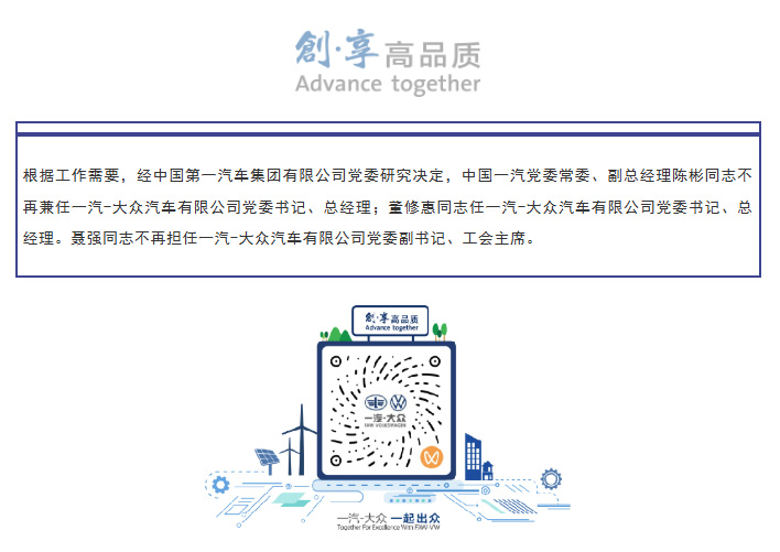 据一汽大众官方消息,根据工作需要,经中国第一汽车集团有限公司党委研究决定,中国一汽党委常委、副总经理陈彬同志不再兼任一汽-大众汽车有限公司党委书记、总经理;董修惠同志任一汽-大众汽车有限公司党委书记、总经理。聂强同志不再担任一汽-大众汽车有限公司党委副书记、工会主席。