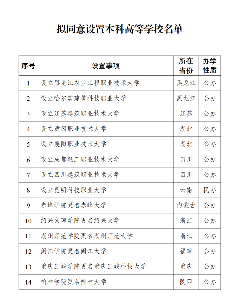 记者近日从教育部获悉,根据有关规定,经教育部党组会议审议,拟同意设置黑龙江农业工程职业技术大学等14所学校。教育部自2026年1月12日至1月16日对名单进行公示。(记者魏冠宇)